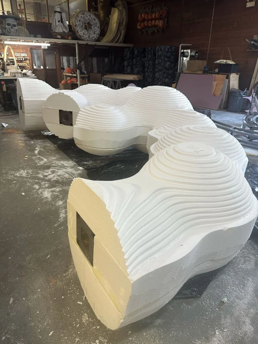 This cloud project was built with a basic CNC carved form in 1 lb/cf styrofoam that was built by Daedalus Design and Production in Brooklyn, NY. PRG designed and built a truss that was embedded in the middle of the styrofoam blocks. It was assembled at Dogwood Entertainment production shop in Poughkeepsie, then sprayed with 2 lb foam and sanded to create the surface. Then it was sprayed with VFI poly-urea hard-coat, and primed and painted with a flat white finish.